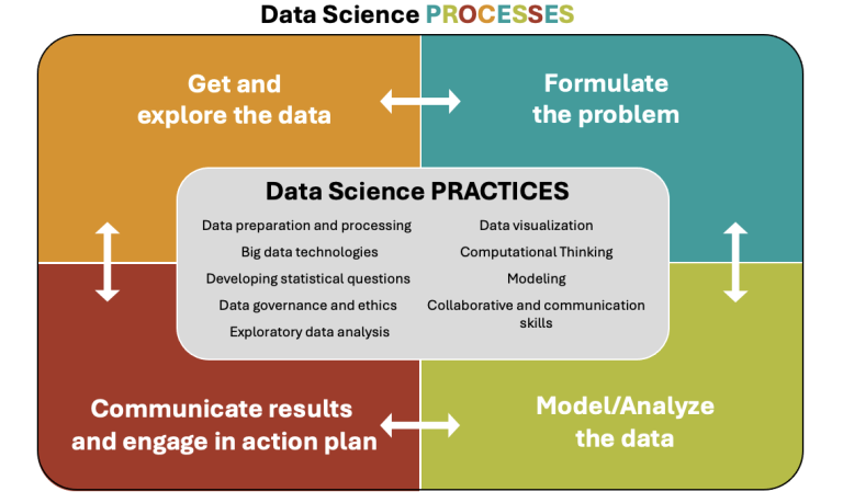 The data science process, tailored for pre-service teachers, is a streamlined four component process. Data science is not seen as a cyclical process, but rather as four components that interconnect and do not have a fixed sequential order: Get and explore data – Formulate problem – Model/Analyze data – Communicate results and action plan