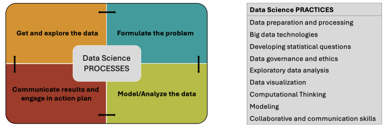 - DIMENSION 1: Describes the four-component PROCESS for doing data science and consists of the data sciences processes and aligned data science practices. In our DATASETUP modules we want preservice teachers to navigate through the process and practices of doing data science.